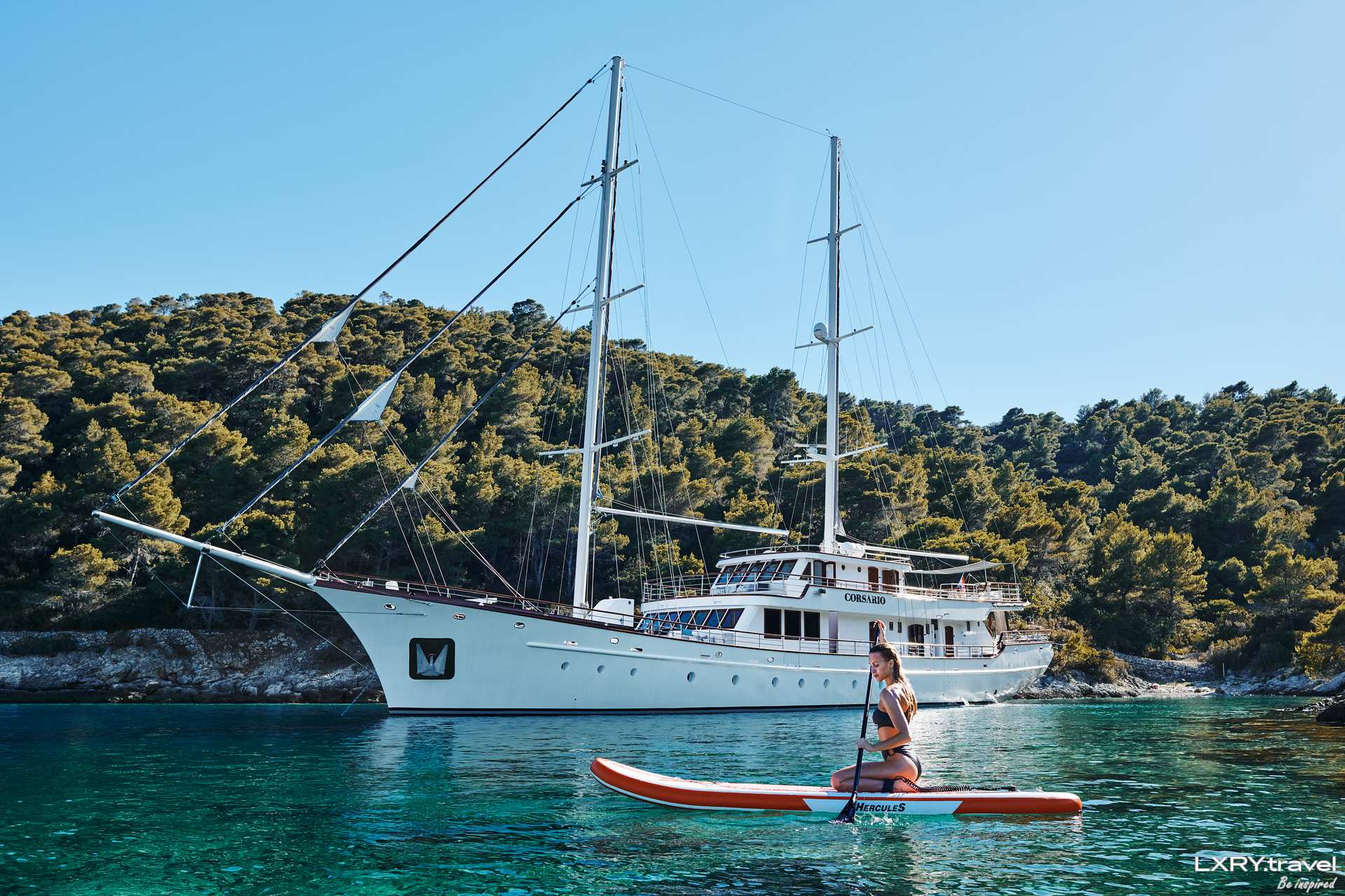 Luxurious sailing yacht Corsario has a large main deck which has a lounge and a dining area where you can enjoy your meal while watching the horizon of the Adriatic Sea. The Fly bridge is the perfect place for the guests to relax having a sunbathing area, sauna room and a Jacuzzi.