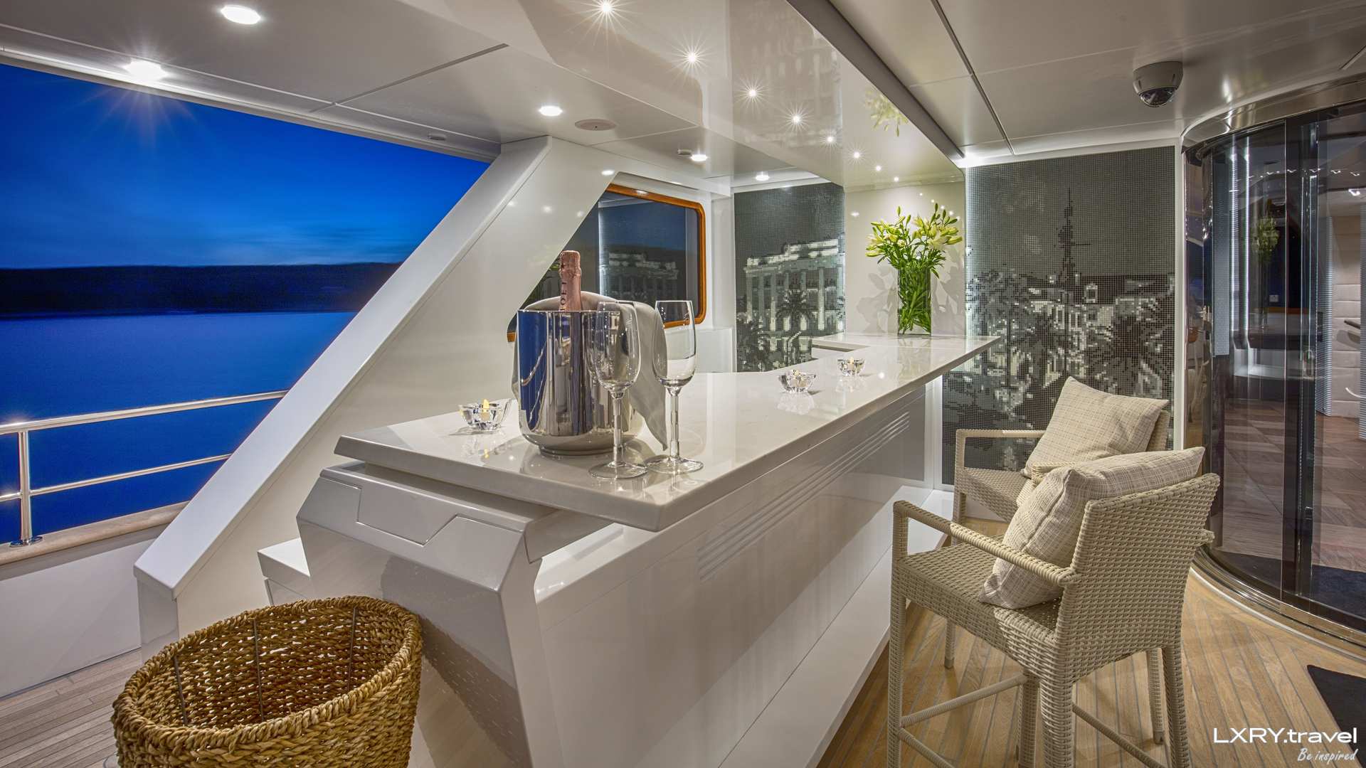 Extravagant M/Y Katina comes with a large gym with the latest state of the art equipment; inclusive of a sauna, shower and massage salon. She features a large Jacuzzi for six on the upper deck. Passengers can relax on a sun lounger or the unique meditation style pillows and decking surrounding the Jacuzzi. One of her more distinguished attributes is a whiskey bar and dedicated cigar room with a fireplace. The dining room can be converted to an open-plan party area, complete with bar and grand piano. Experience authentic cinema with KALEIDESCAPE 3D and over 400 movies in Blu-ray quality.