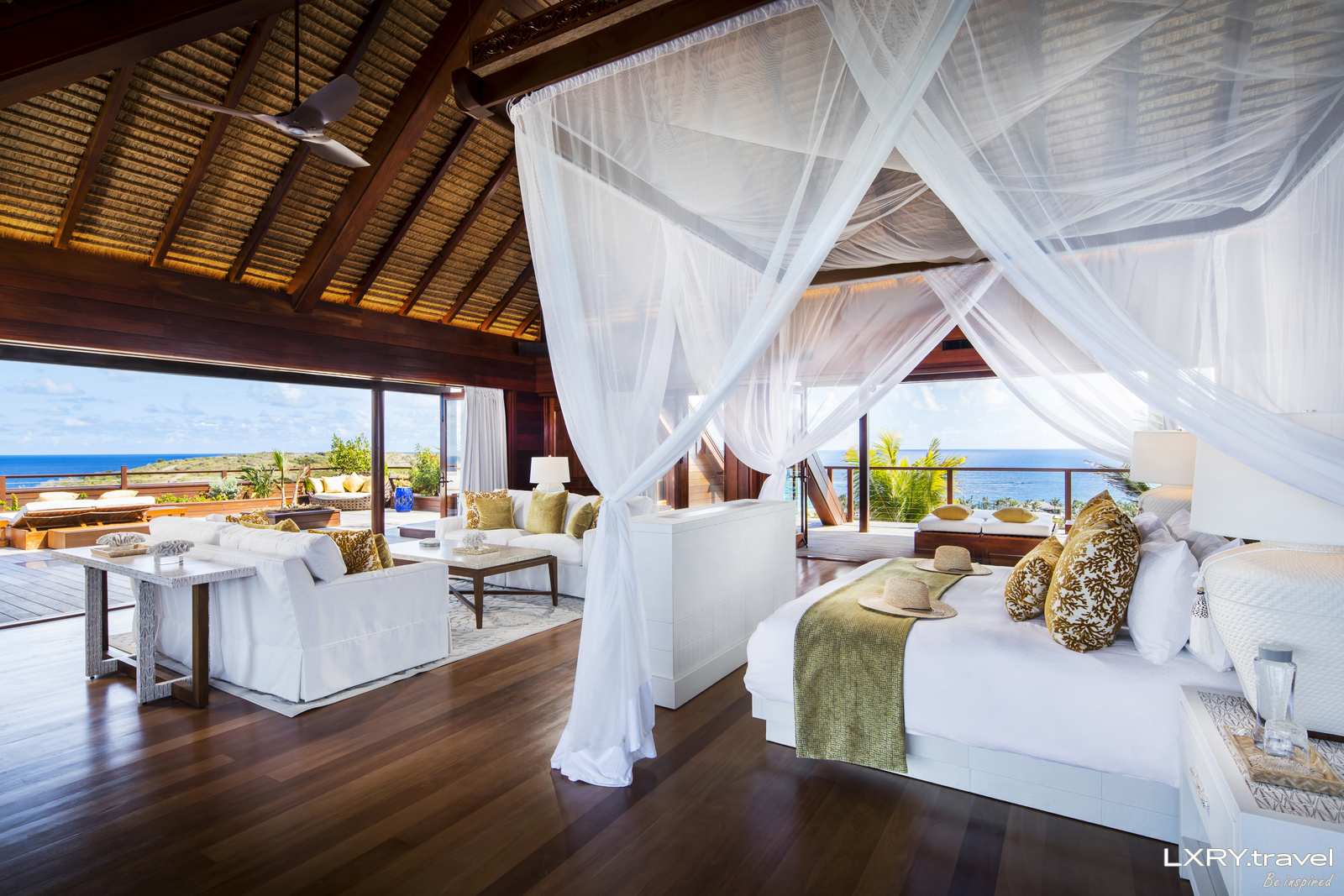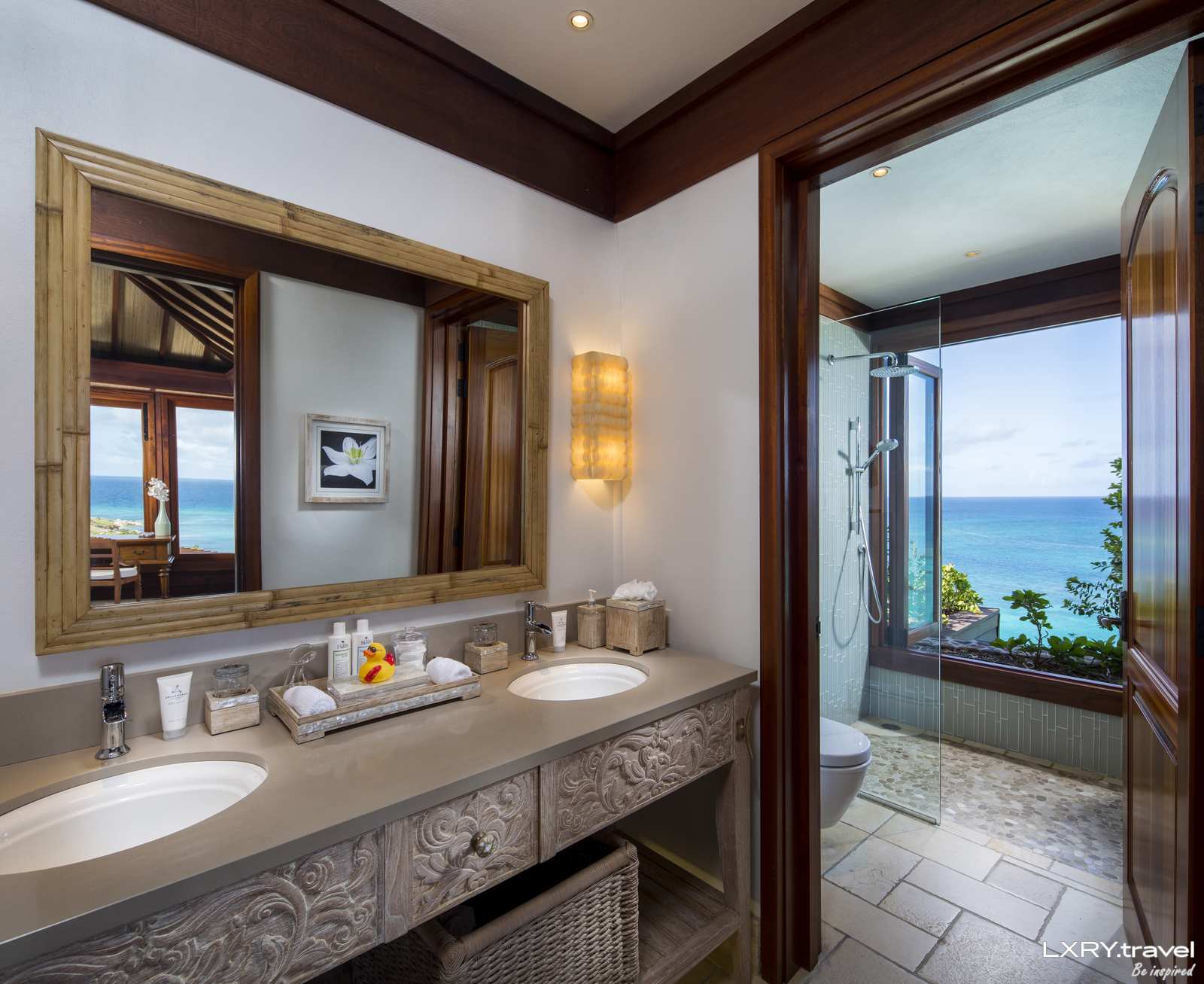 The spacious Master Suite is located on the top floor of the Great House with amazing views which can be enjoyed from one of three terraces. The hot tub and outdoor bathtub are located on the largest terrace and there is also a flat screen TV at the foot of the bed. It is equipped with a king size bed, a kitchenette and a spacious en-suite bathroom, an indoor and outdoor shower, and 180-degree ocean views. The Master Suite also has an indoor and outdoor music system, and a separate restroom.