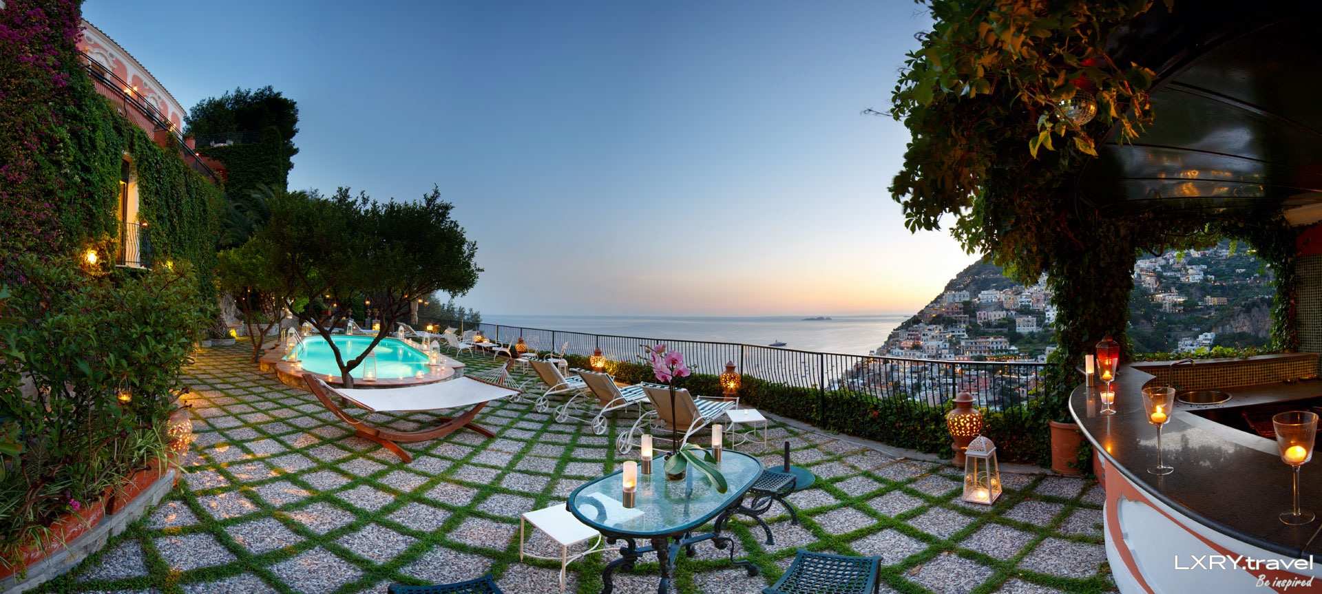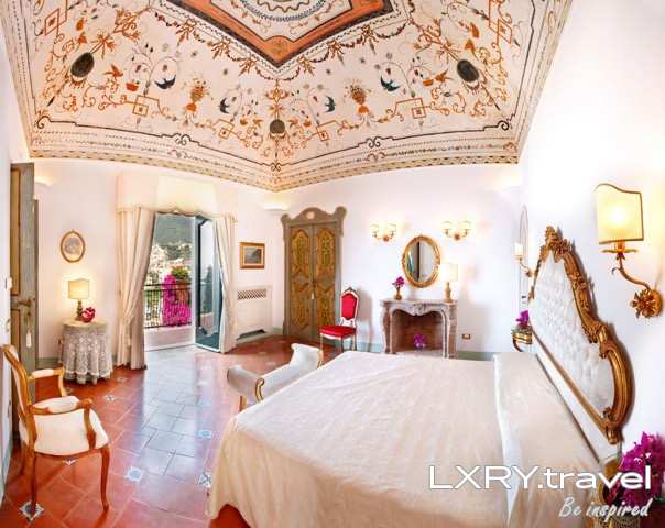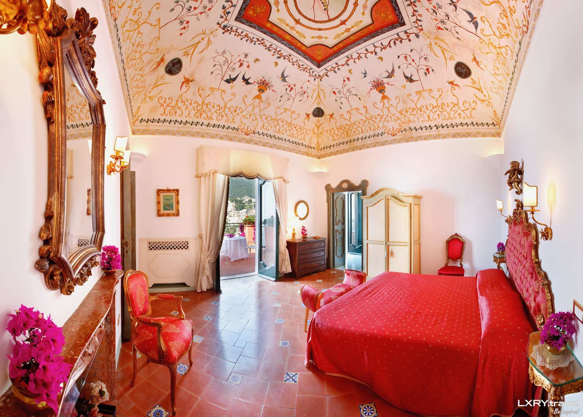 With its regimental, classic aesthetic, this 750 m2 villa is done up in shades of Amalfi Coast red and white and decorated with glass doors that opens to terraces and the infinity view of the seafront Positano. Set on the highest point of town, the three-level house affords views of the scenic landscape from almost every angle. On the sweeping grounds, there’s a heated swimming pool and a solarium with sunbeds for all guests. Very