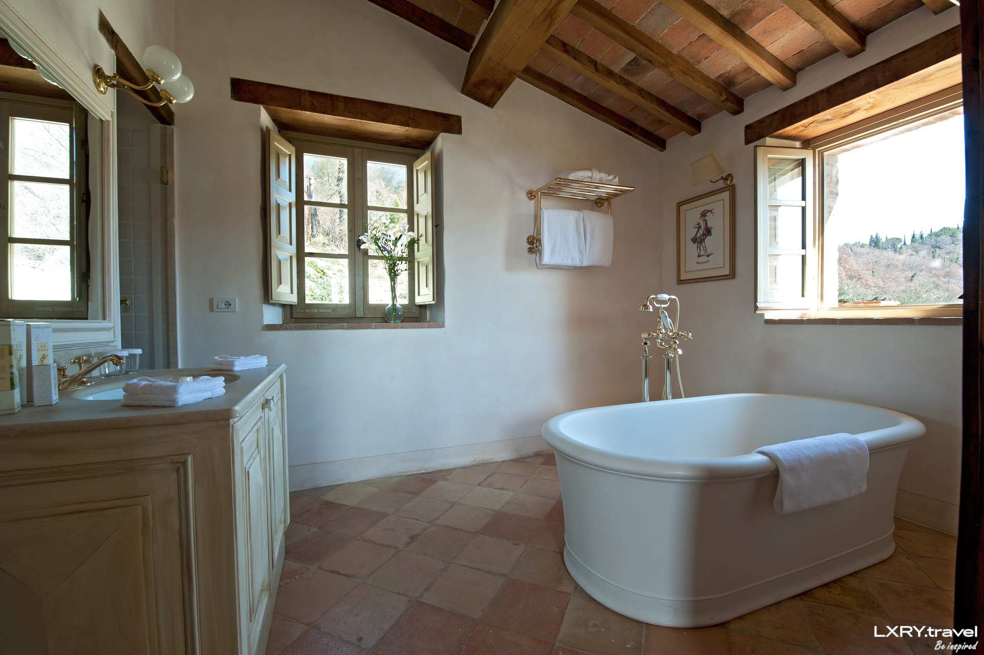 greens, violets and yellows. Guests’ favourite pastime is generally reading on the south-facing lawn or at the large pool, pausing after chapters to take in the ever-changing colours of the vast mountain ranges. There are plenty of paths for long walks on the hillside behind the house (the estate features 3 hectarers of private grounds) and the staff of the villa can provision guests with specially prepared picnic baskets. Private cooking classes, truffle hunting, wine-tasting as well as biking, hiking and watercolour painting classes are regularly organised here; we also recommend a visit to the famous 18-hole golf course designed by Robert Trent Jones Jr for all golfers. Much of