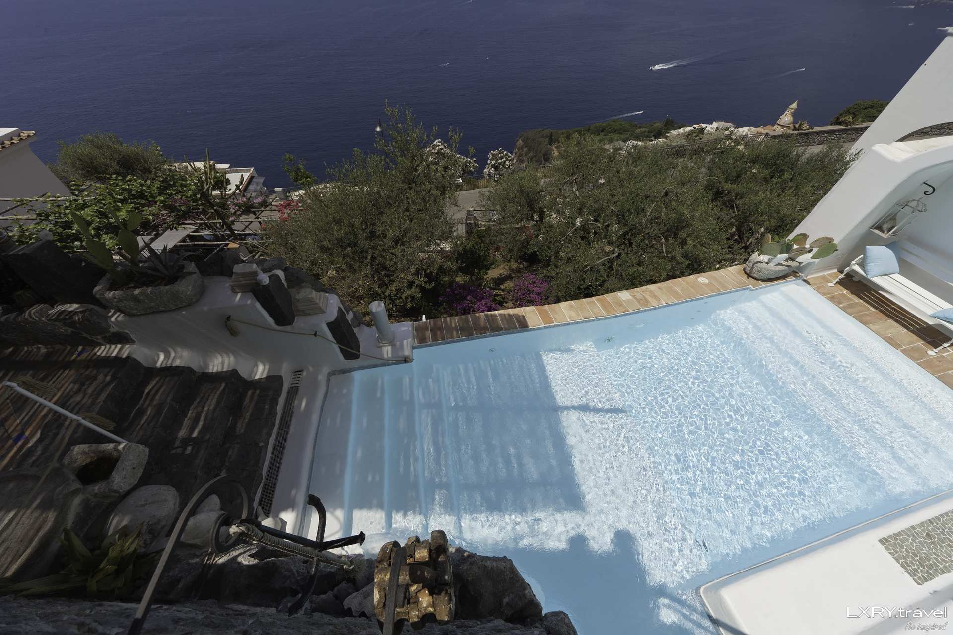 with eclectic interiors, enjoyable alfresco areas and a spectacular view of the sea. The bedrooms are decorated in Amalfi coast style with washed walls in vivid shades, contemporary fabrics, books and items, which lend a personal touch. The extension of the Wi-Fi is the first floor and part of the swimming pool. The interior of the property measures 500 square meters and it can accommodate a total of 6 adults, 1 child (from 2 to 9 years old) and 1 extra friend or staff in a bedroom without air conditioning. Best used for 6 people, total. The estate includes 200 square meters of private terraces.