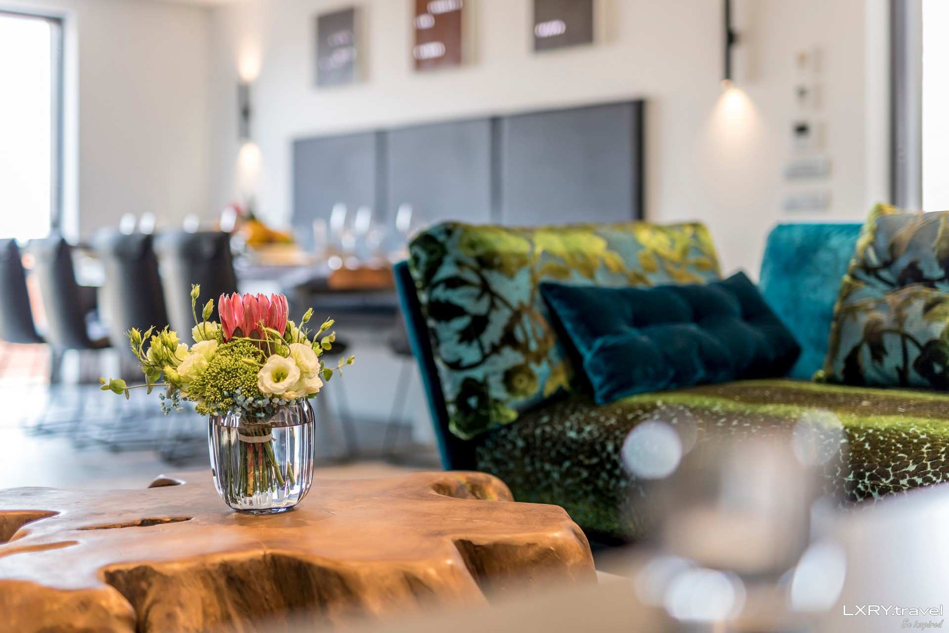 Climbing the stairs to the villa's first floor, which can be reached by elevator as well, you come to the comfortable living-dining area with a kitchen, creating an open space concept.