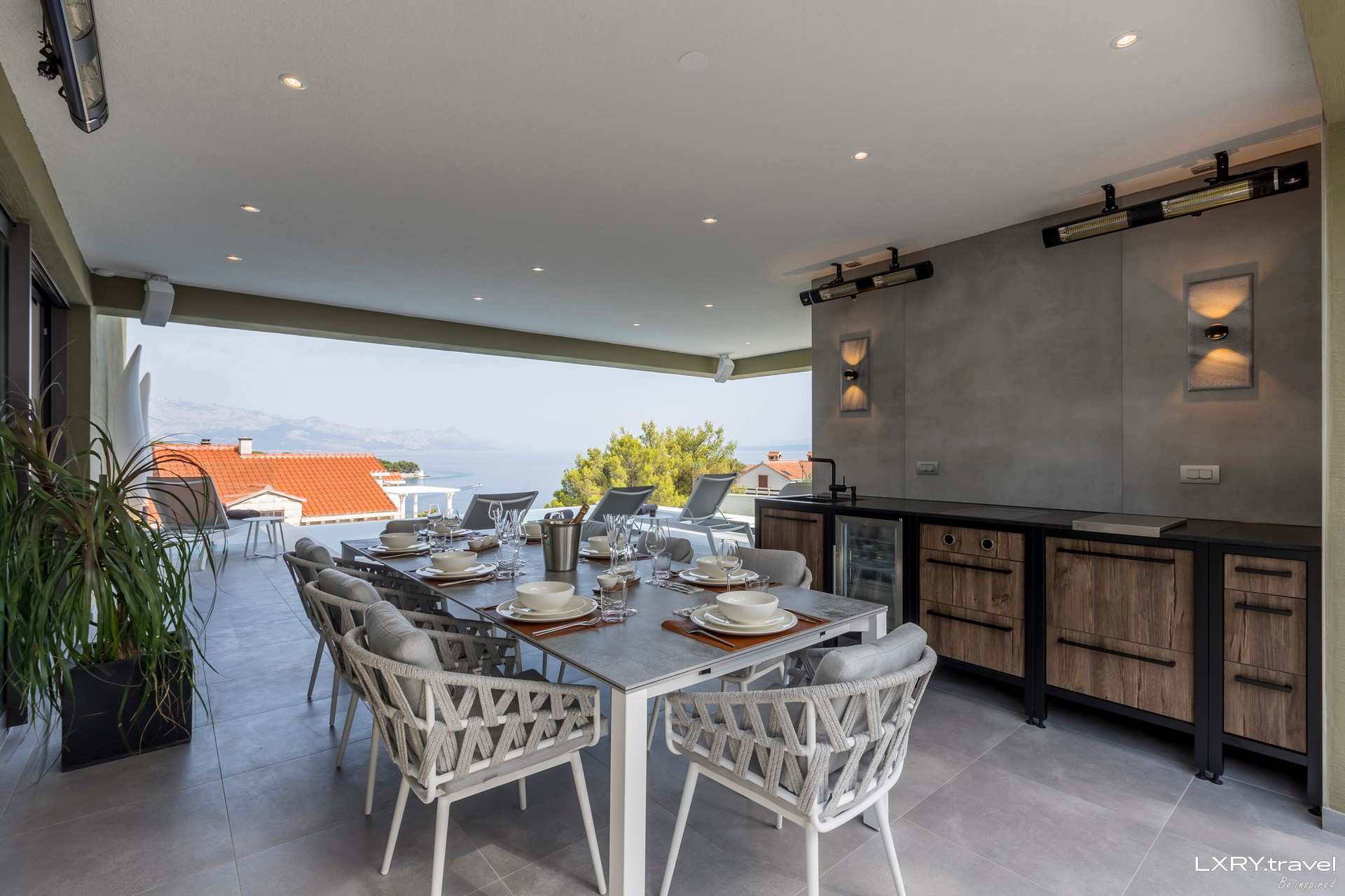 The outdoor terrace can be reached from the living room, where there is an outdoor dining table for 8 people and an outdoor kitchen.